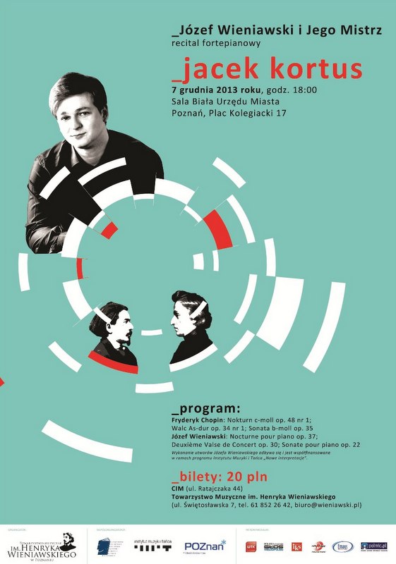 Program recitalu: Fryderyk Chopin, Nokturn c-moll op. 48 nr 1, 1841 r., Fryderyk Chopin, Walc As-dur op. 34 nr 1, 1838 r., Fryderyk Chopin, Sonata b-moll op. 35, 1839 r., Józef Wieniawski, Nocturne pour piano op. 37, ca. 1884 r., Józef Wieniawski, Deuxième Valse de Concert op. 30, ca. 1880 r., Józef Wieniawski, Sonate pour piano op. 22, ca. 1858 r.