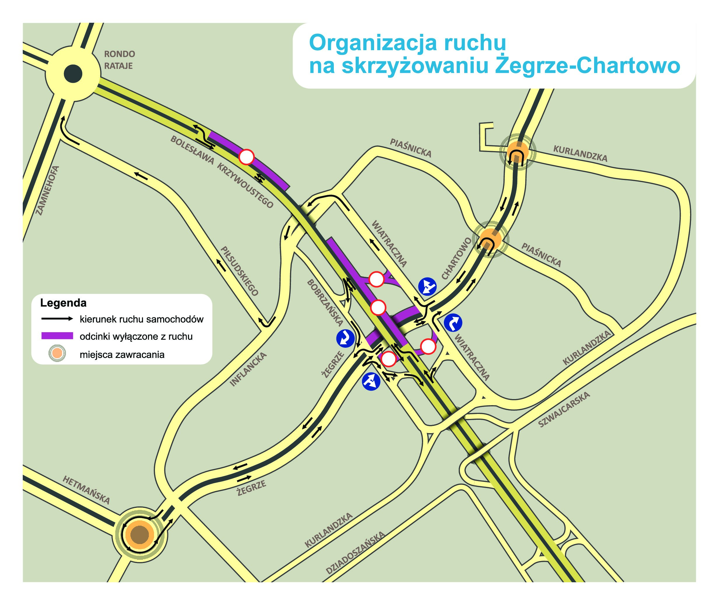 W nocy ruszył następny etap budowy wiaduktu wlotowego do Poznania nad ulicami Chartowo - Żegrze. To trasa wlotowa od strony Kórnika. Dla kierowców zamknięto część ulicy Chartowo/Żegrze. Od strony ulicy Wiatracznej wyłączono także łącznice wyjazdowe na ulicę Krzywoustego.