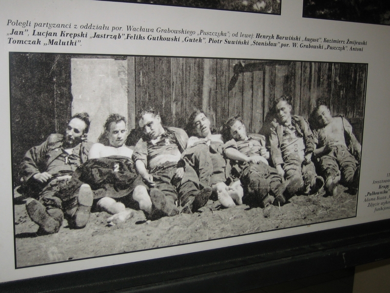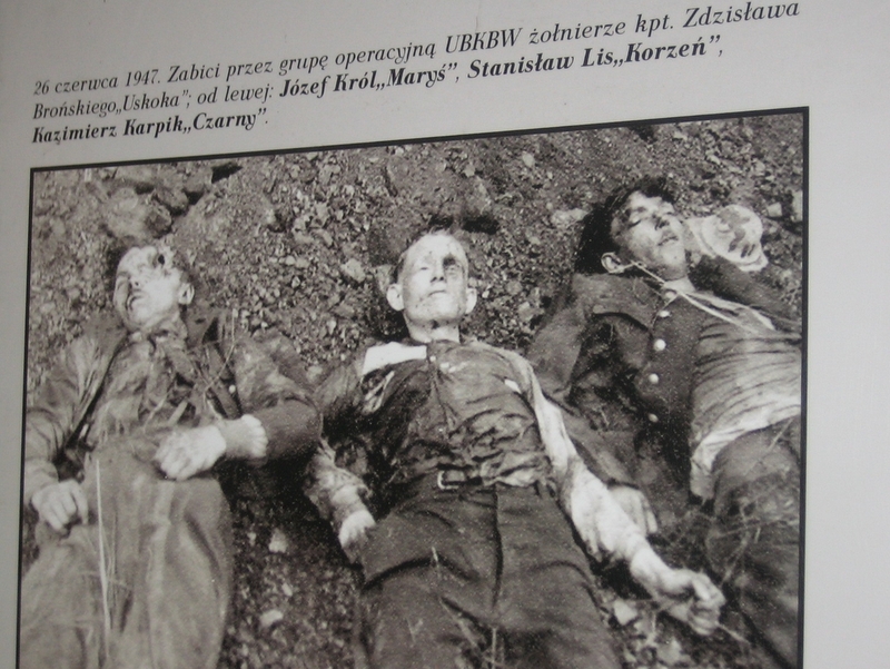 Na wystawie prezentowane są zdjęcia z archiwów Urzędu Bezpieczeństwa, na których pokazano ciała żołnierzy powojennego podziemia niepodległościowego tuż po ich zabiciu. Widać twarze z dziurami po kulach, krwawe plamy na ubraniach. Na jednym siedmiu zastrzelonych partyzantów ułożono na siedząco przy drzwiach stodoły.