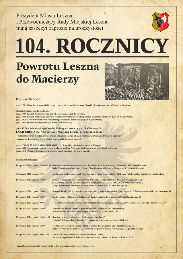 Obchody zainaugurowała msza św. w intencji Ojczyzny i powrotu Leszna do Macierzy w Bazylice św. Mikołaja. Dzisiaj w ich programie jeszcze m.in. uroczysta sesja rady miasta, piknik "Zasmnakuj Wolności" na ul. Wolności oraz manifestacja patriotyczna na Rynku z udziałem Wojska Polskiego i służb mundurowych.