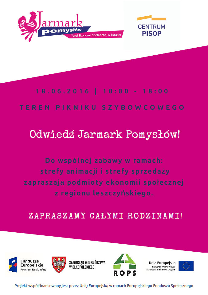 Koguty zaczynają głośno piać zapowiadając zbliżające się wyjątkowe wydarzenie w Lesznie! Już 18 czerwca podczas Pikniku Szybowcowego odbędą się Targi Ekonomii Społecznej – Jarmark Pomysłów. Jarmark Pomysłów jest największym wydarzeniem w subregionie leszczyńskim, podczas którego mogą się zaprezentować liczne podmioty ekonomii społecznej z Leszczyńskiego tj. fundacje, stowarzyszenia, spółdzielnie socjalne, centra integracji społecznej, warsztaty terapii zajęciowej. Podczas tegorocznej edycji Targów dla odwiedzających zostaną przygotowane dwie strefy: animacji i sprzedaży.