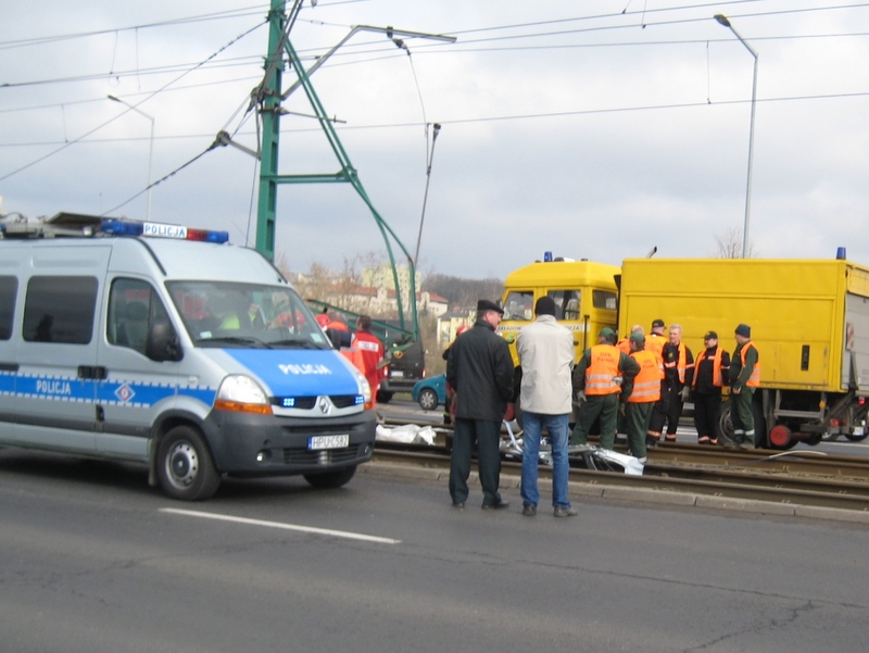 Przed godz. 9 Peugeot 206 wypadł na torowisko, auto uderzyło w słup trakcyjny. To uderzenie było na tyle silne, że silnik wypadł z auta i zatrzymał się kilkanaście metrów dalej. Strażacy mieli bardzo duży problem z uwolnieniem poszkodowanych z zgniecionej karoserii. Świadkowie opowiadali, że samochód jechał z bardzo dużą prędkością i podczas wyprzedzania kierowca stracił nad nim panowanie. Później Peugeot wpadł na torowisko tramwajowe i dosłownie owinął się wokół słupa trakcyjnego.