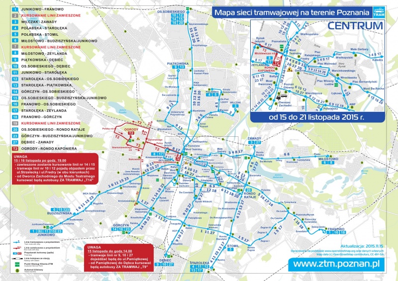 Przez tydzień drogowcy będą montować sieć trakcyjną na Rondzie Kaponiera. Muszą połączyć stare kable z nowymi. Dzięki temu tramwaje jeszcze w tym roku będą mogły skręcać z Ronda Kaponiera w stronę Świętego Marcina. Od niedzieli pasażerowie powinni jednak dokładnie czytać rozkłady jazdy, bo zmiany w kursowaniu tramwajów będą bardzo duże i dotyczą całego Poznania. Szczegóły tutaj.