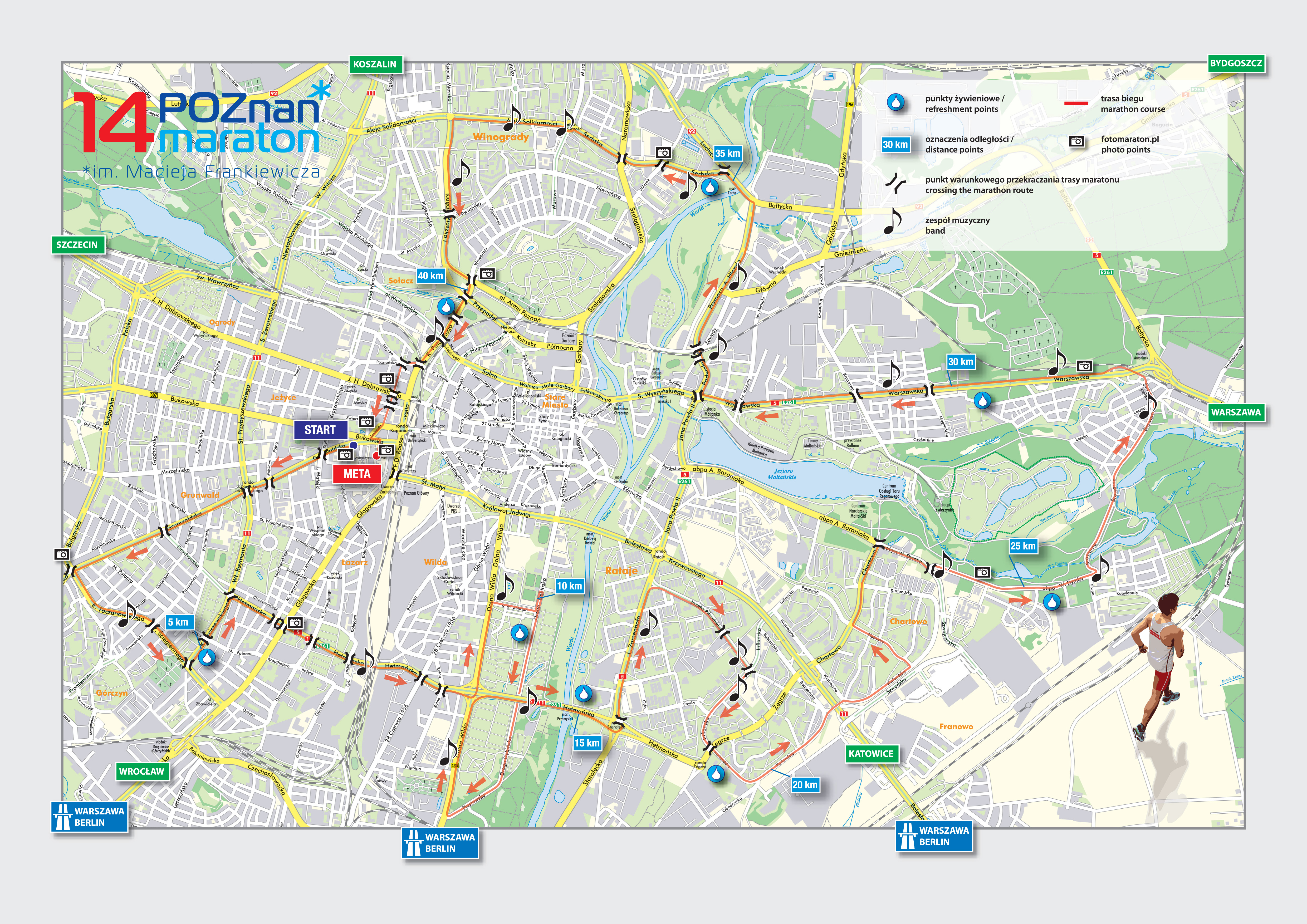 Trasa tegorocznego 14 Maratonu biegnie od Grunwaldu, przez Górczyn, Łazarz, Wildę, Rataje, Chartowo po Winogrady i Sołacz. Zawodnicy przebiegną 33 ulicami, rondami i arteriami komunikacyjnymi. Zmiany w organizacji ruchu będą na 90 skrzyżowaniach. Na 47 - będą śluzy do przejazdów. Start Maratonu - o godzinie 9.00 , z ulicy Grunwaldzkiej przy MTP, meta - Plac Św. Marka, MTP.