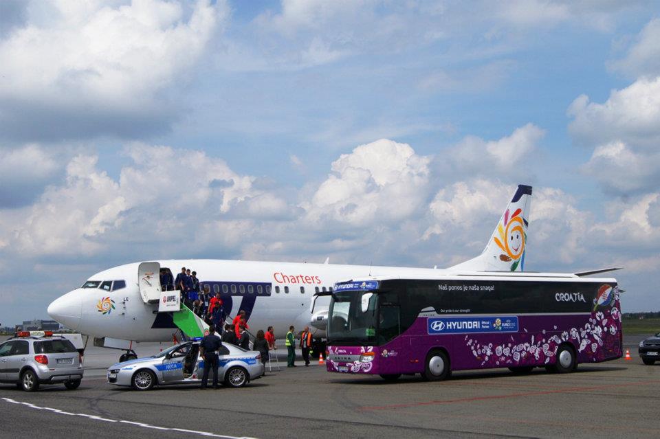Po godzinie 12 (w 10 minutowym odstępie) w Poznaniu wylądowali piłkarze reprezentacji Włoch i Chorwacji. W czwartek zagrają na Stadionie Miejskim. Przylecieli należącymi do LOT-u Boeingami 747. Pod samoloty na płytę podjechały autobusy i od razu zawiozły zawodników do hoteli. Autobusy opuściły lotnisko przez bramę przy starym terminalu gdzie nie było kibiców. Tymczasem do Poznania ciągle przylatują i przyjeżdżają fani obu zespołów.