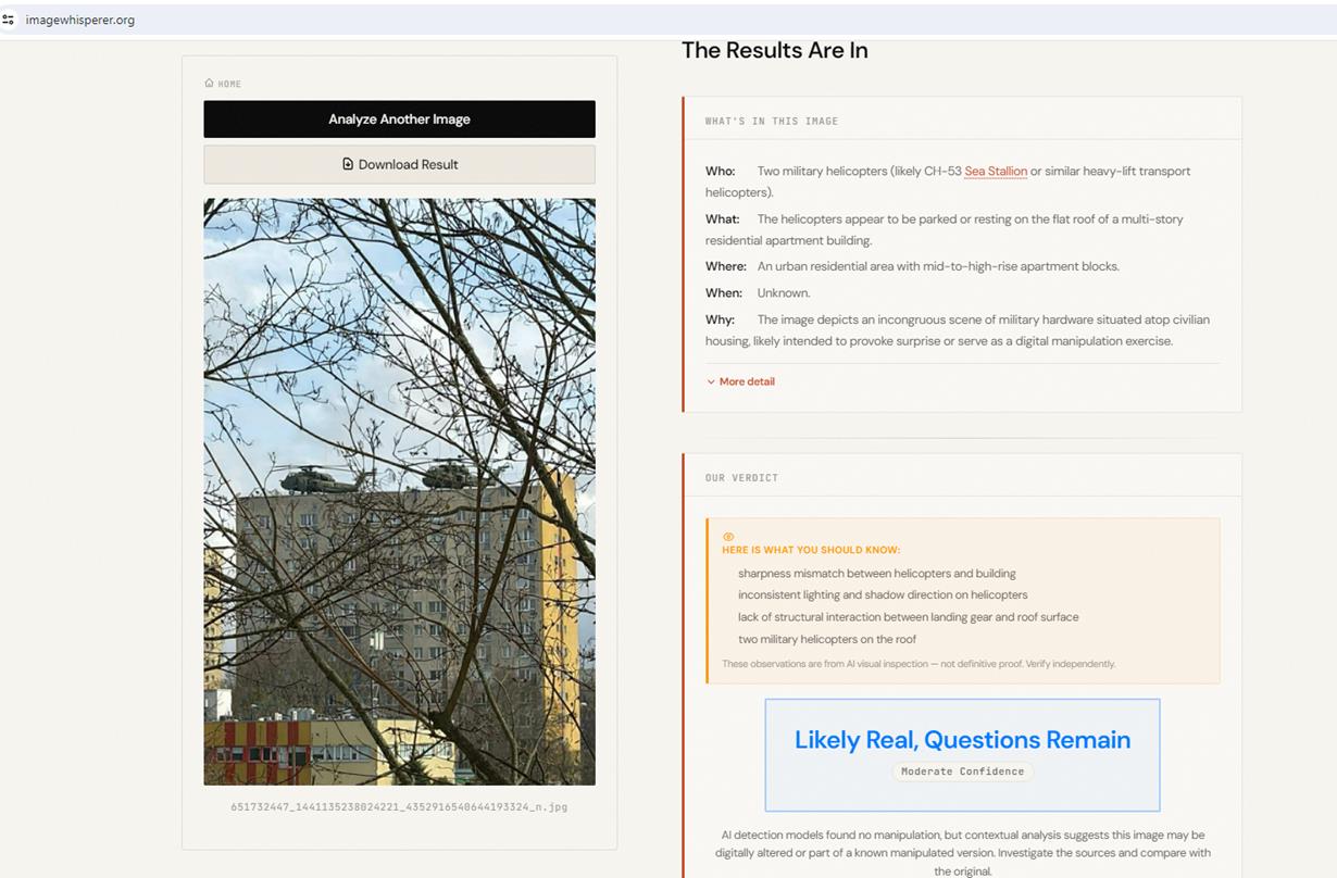 Do sprawdzenia wiarygodności zdjęcia wykorzystaliśmy dwa niezależne narzędzia: zerogpt.com oraz imagewhisperer.org. Rezultat był zaskakujący – jedno z nich w ponad 90 procentach potwierdziło jego autentyczność. Drugie również wskazało wysokie prawdopodobieństwo prawdziwości, ale zwróciło uwagę na kilka wątpliwości.