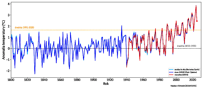 Wykres średniej anomalii rocznej temperatury powietrza dla obszaru współczesnej Polski od roku 1800 do 2025 (https://naukaoklimacie.pl/wykres-na-dzis/anomalia-temperatury-rocznej-polski-1800-2025)