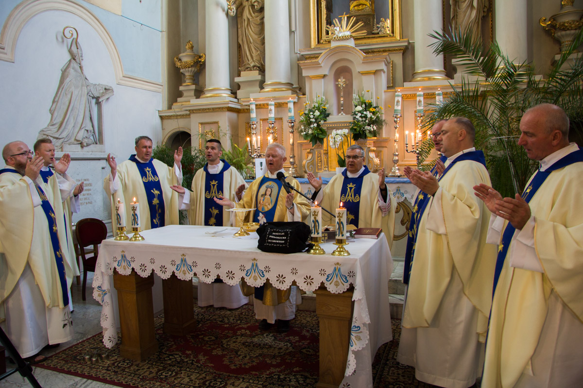 Wyjątkowo tegoroczna Msza św. w Sejnach odbyła się nie w bazylice, ale w kaplicy Matki Bożej Sejneńskiej, co pielgrzymi odczytali, jako szczególny dar. W normalnych warunkach cała bazylika ledwo mieści uczestników corocznych pielgrzymek do Ostrej Bramy, więc Matce Bożej pielgrzymi zazwyczaj szli się pokłonić po zakończonej Mszy św. Tym razem ze względu na to, że do Wilna udali się tylko przewodnicy poszczególnych grup, można było eucharystię sprawować w tym wyjątkowym miejscu. Przewodniczył jej ks. Andrzej Dębski SAC, który jest przewodnikiem grupy zielonej. Koncelebrowali ją wszyscy księża uczestniczący w pielgrzymce oraz ks. prałat Zbigniew Bzdak, proboszcz miejscowej parafii i kustosz sanktuarium. Na eucharystię przybyli także duchowi pielgrzymi z Sejn, co stało się wzruszającym wyrazem jedności, z tymi, którzy w ich imieniu pieszo podążają ku Ostrej Bramie.