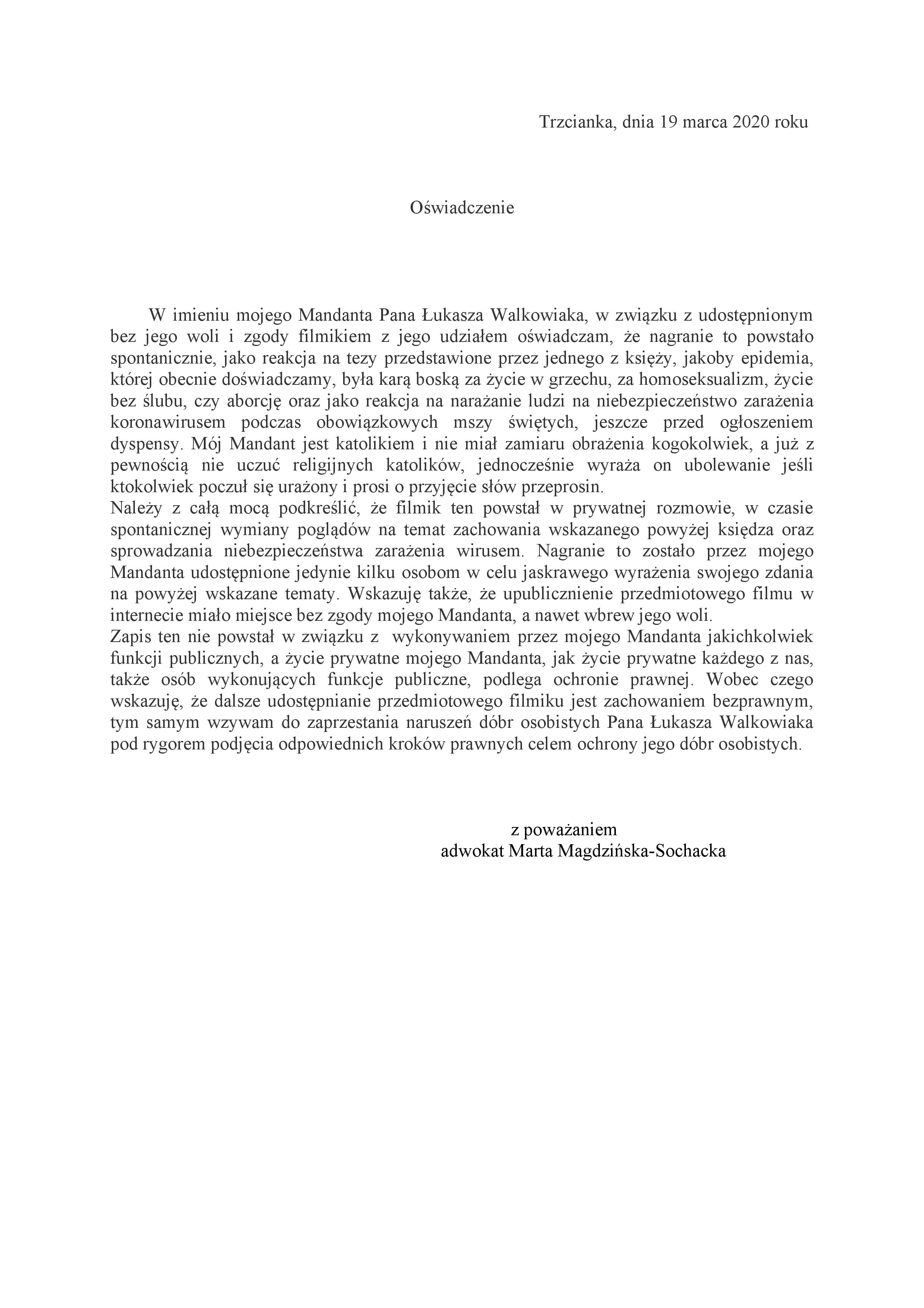 Otrzymaliśmy oficjalnie oświadczenie Łukasza Walkowiaka w sprawie filmu: