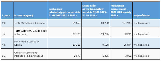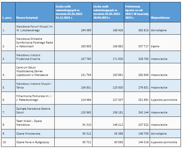Najchętniej odwiedzaną przez Polaków instytucją kultury, prowadzoną lub współprowadzoną przez Ministerstwo Kultury i Dziedzictwa Narodowego w zeszłym roku i przez pierwsze trzy kwartały tego roku, jest Narodowe Forum Muzyki im. W. Lutosławskiego, w którym było ponad 360 tys. widzów.