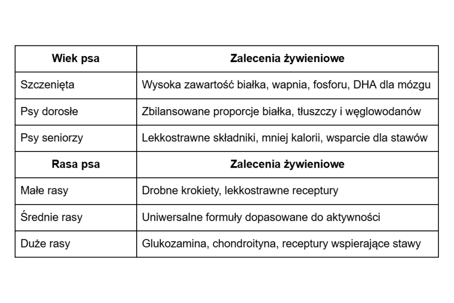 Przygotowaliśmy tabelę zawierającą kluczowe kryteria wyboru karmy w zależności od wieku i rasy psa:
