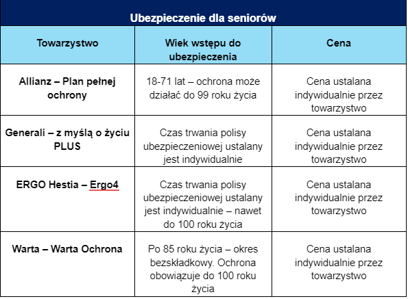 Na rynku istnieje kilka możliwości ubezpieczenia, które mogą spełnić różne potrzeby seniorów. Niektóre oferty zapewniają standardową ochronę, która może być dostępna dla osób nawet do 75 czy 85 roku życia. Jest to opcja godna rozważenia, jeśli seniorom zależy na podstawowej ochronie finansowej.