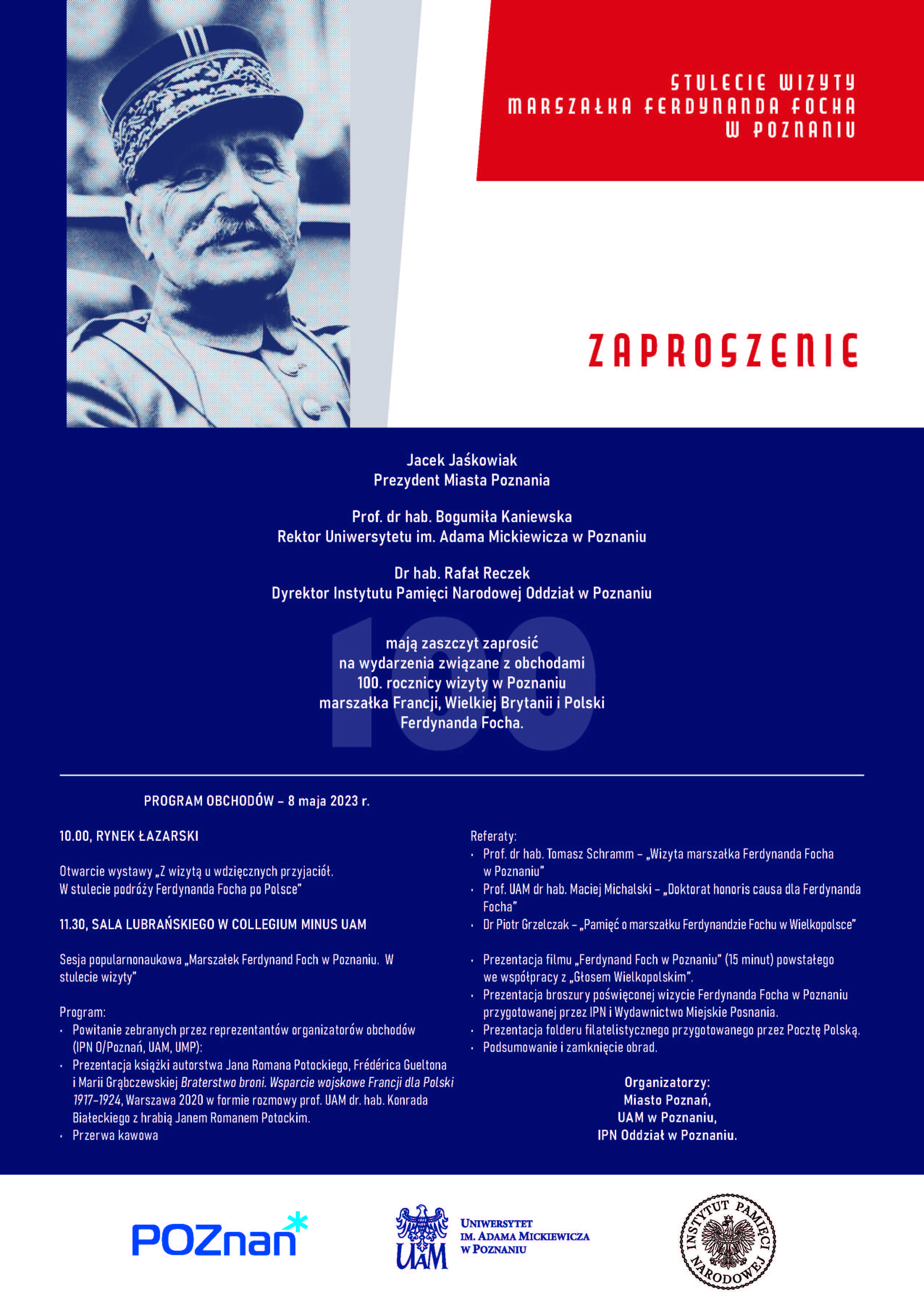 Na poniedziałek w Poznaniu zaplanowano wydarzenia upamiętniające stulecie wizyty marszałka Ferdynanda Focha w stolicy Wielkopolski. Na obchody zapraszają dr hab. Rafał Reczek Dyrektor Instytutu Pamięci Narodowej Oddział w Poznaniu, prof. dr hab. Bogumiła Kaniewska Rektor Uniwersytetu im. Adama Mickiewicza w Poznaniu oraz Jacek Jaśkowiak Prezydent Miasta Poznania.