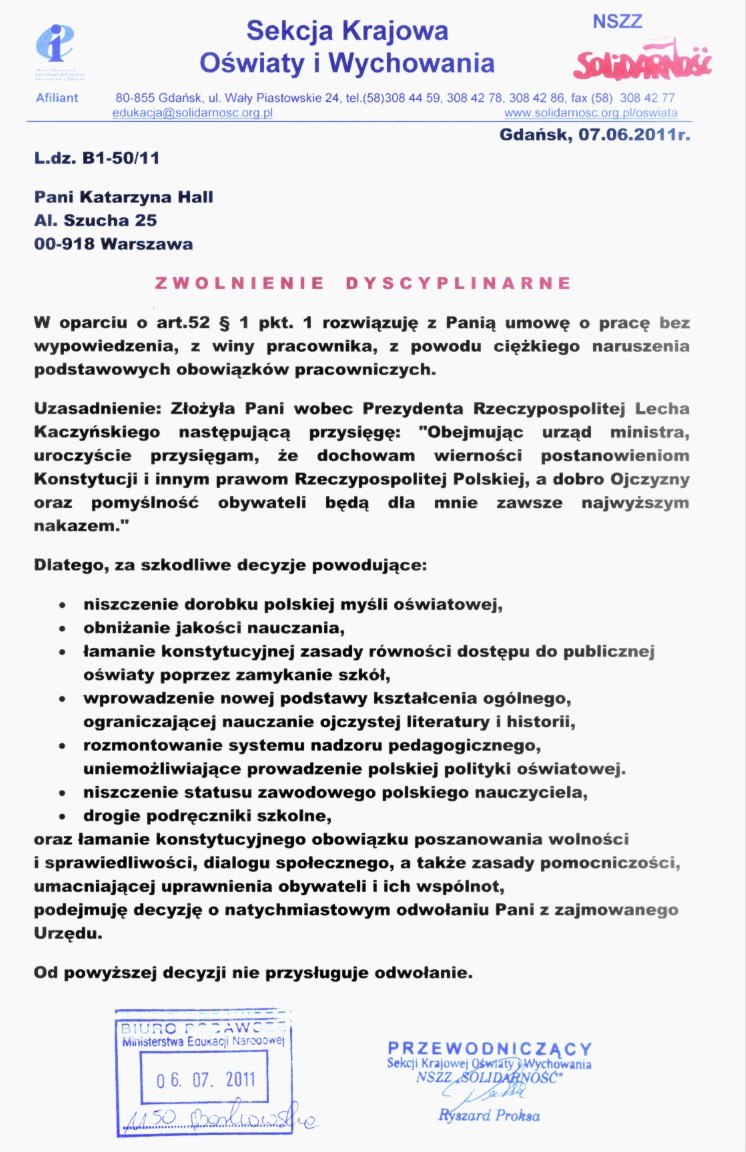 Przedstawiciele Solidarności chcą odwołania Minister Edukacji Narodowej Katarzyny Hall. Związkowcy wręczyli dziś/wczoraj wicewojewodzie wielkopolskiemu Przemysławowi Paci petycję podpisaną przez 150 tysięcy obywateli. - Chcemy wywołać dyskusję w Sejmie nad Ustawą o systemie oświaty - mówi przewodniczący Sekcji Krajowej Oświaty NSZZ "Solidarność", Ryszard Proksa.