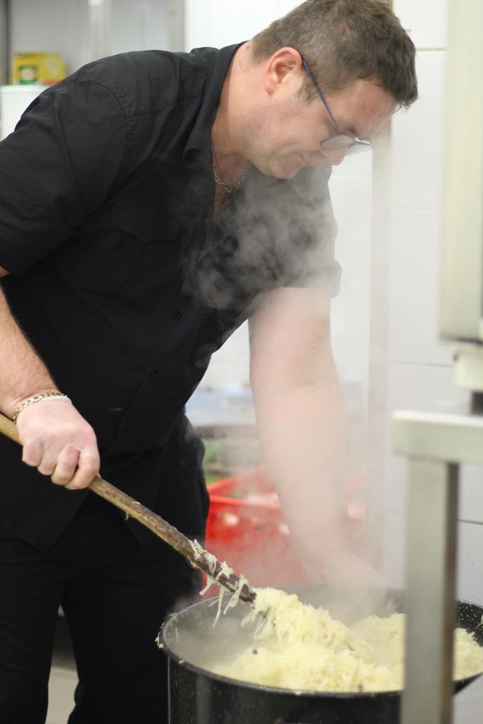 Kuchnia bardzo intensywnie pracuje, salę mamy udekorowaną, dodatkowy namiot - gdyby przyszło więcej osób. Były dwa namioty, ale niestety była wichura, która zniszczyła nam jeden namiot. Ale kuchnia pracuje, od rana końcowe rzeczy, kroimy warzywa do sałatki, ryby są już posmażone, są ulepione pierogi, odbieramy różne darowizny z piekarni - także praca wre