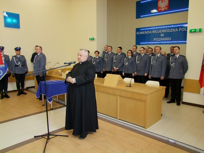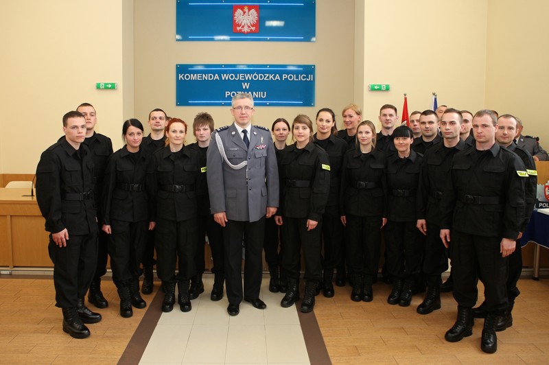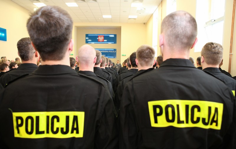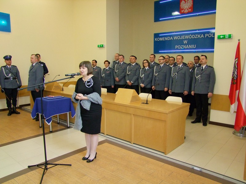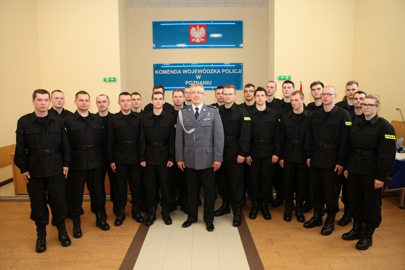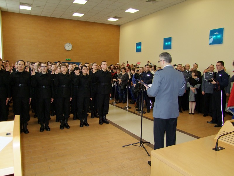Przyjmowani do służby nowi policjanci wypowiedzieli słowa roty ślubowania: "Ja obywatel Rzeczypospolitej Polskiej, świadom podejmowanych obowiązków policjanta, ślubuję: służyć wiernie Narodowi, chronić ustanowiony Konstytucją Rzeczypospolitej Polskiej porządek prawny, strzec bezpieczeństwa Państwa i jego obywateli, nawet z narażeniem życia (…)”