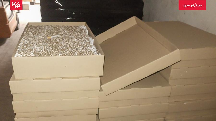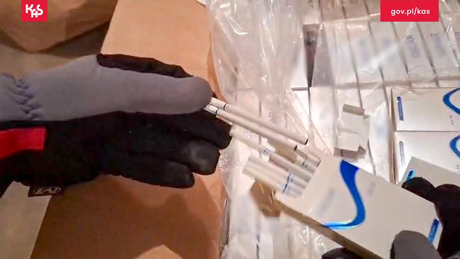 Na gorącym uczynku zatrzymano mężczyznę, obywatela Polski, który rozładowywał kontrabandę. Gotowe paczki papierosów były dostarczane do Polski spoza Europy drogą lotniczą, a następnie samochodem przywożone do magazynu