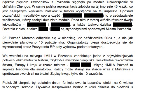 W sprawozdaniu przygotowanym przez urzędników ukryto także dane zwycięzców turnieju tenisowego w Poznaniu czy imprez wioślarskich. Imiona i nazwiska tych osób są zamalowane na czarno.