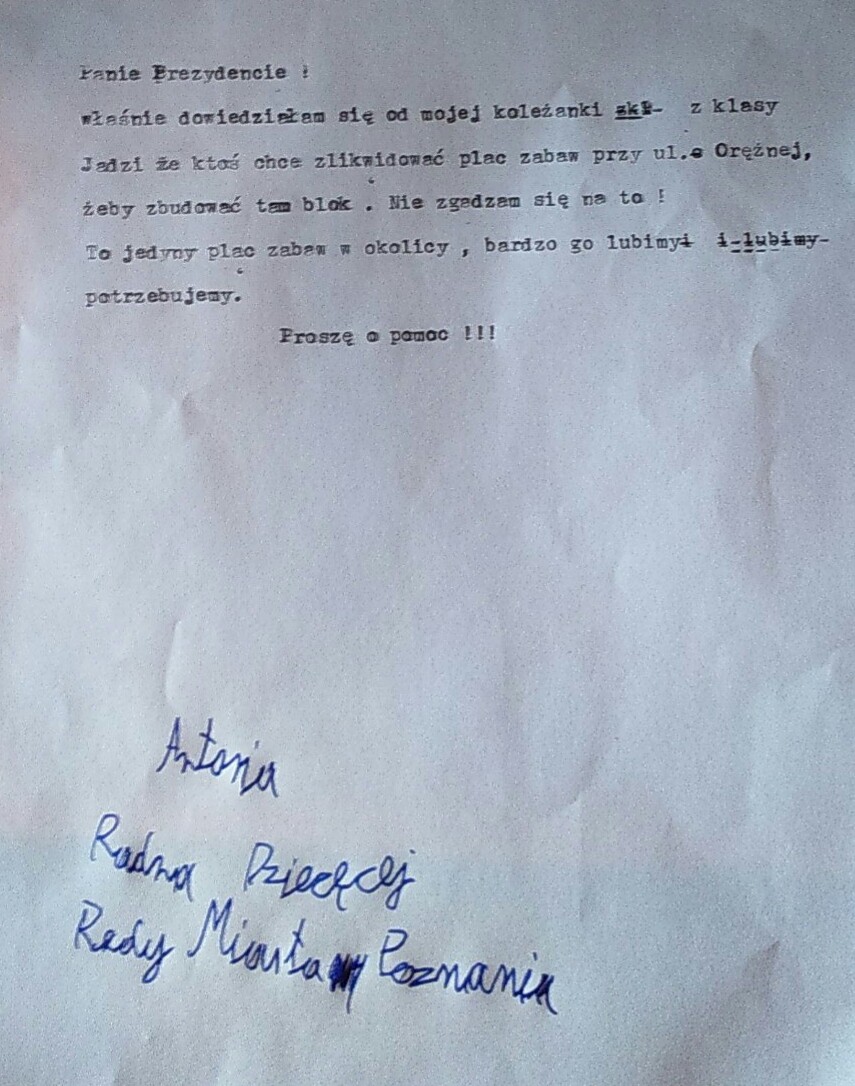 Antosia powiedziała naszemu reporterowi, że jeśli jeden list w sprawie placu zabaw nie pomoże - będzie pisać kolejne. Dziewczynka nie wyklucza pisania listów także w innych - jak nam powiedziała - ważnych sprawach.