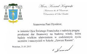 Do dyrektor szkoły osobiście kilka dni temu zadzwonił jałmużnik papieski arcybiskup Konrad Krajewski pytając o potrzeby placówki. Teraz przyszedł od niego list. Arcybiskup napisał „W imieniu Ojca Świętego Franciszka z radością pragnę przekazać dar finansowy na budowę windy, która będzie wielkim ułatwieniem w codziennym życiu uczniów i nauczycieli w Szkole «Zawsze Razem»”.