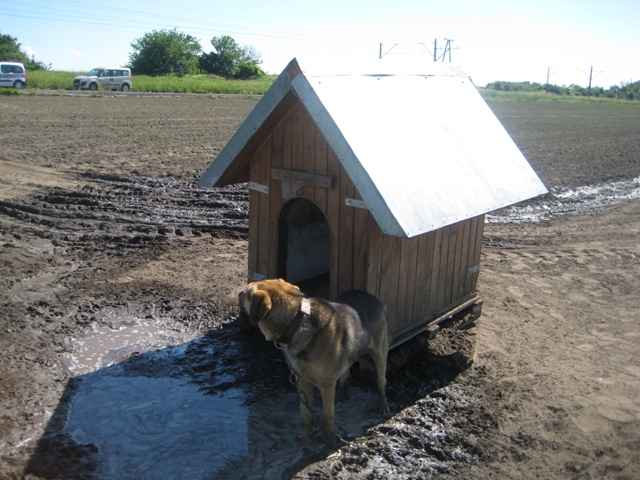 Buda na środku pola. Przed nią kałuża wody. Obok dwie miski: z karmą i wodą. Taki widok zastaliśmy. Właściciel tłumaczy, że pies Gucio to jego najlepszy sposób na odstraszanie dzikich gęsi, które niszczą uprawy.