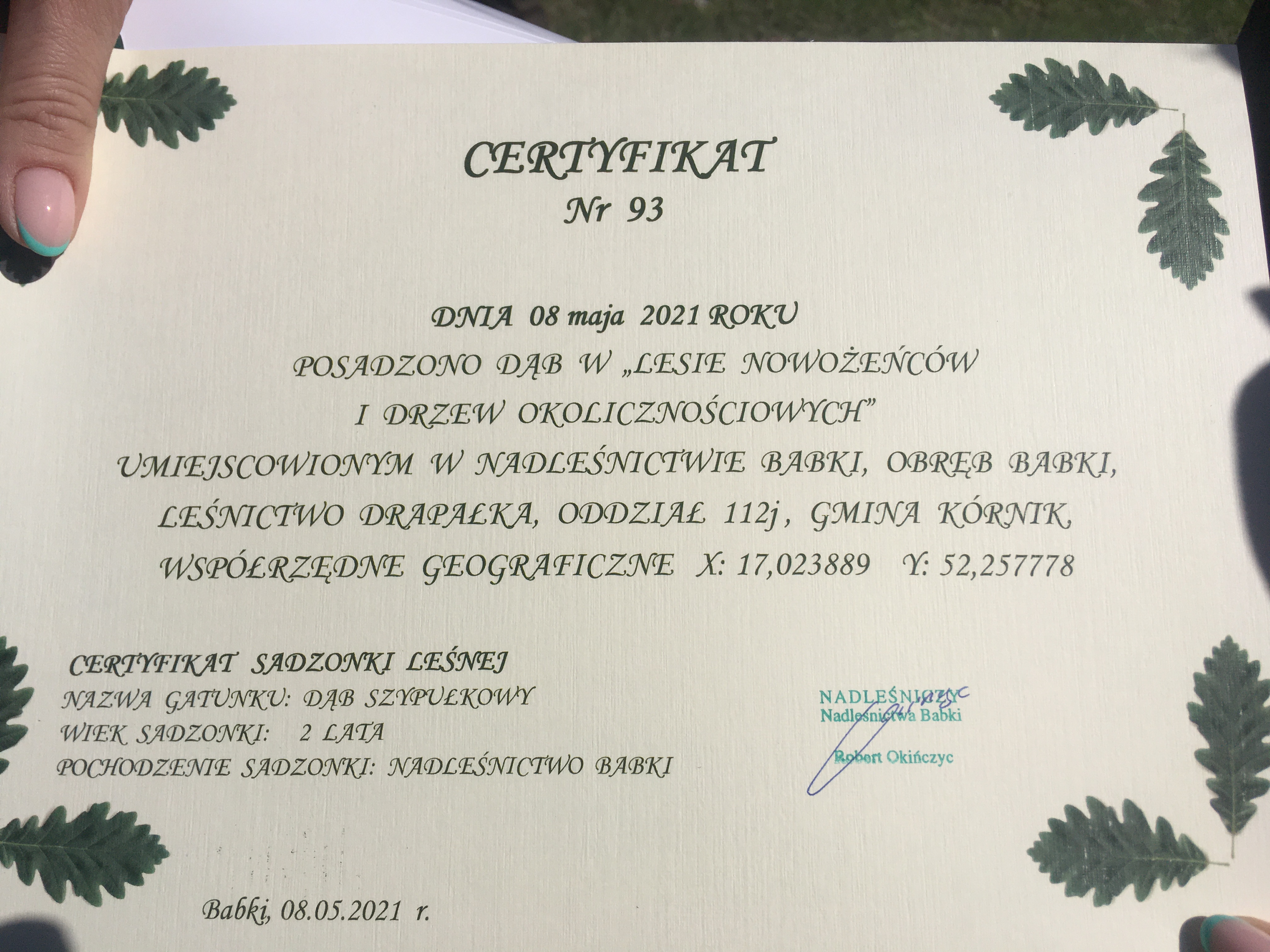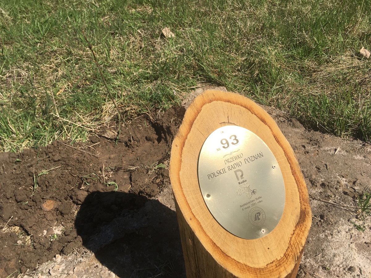 Tożsamość nowego drzewa poświadcza tabliczka z logo Radia Poznań, umieszczona na pniu wbitym w ziemię obok sadzonki. Tabliczka informuje, że nasze radiowe drzewo ma na tej okolicznościowej uprawie numer 93. Dostaliśmy też papierowy certyfikat potwierdzający wydarzenie.