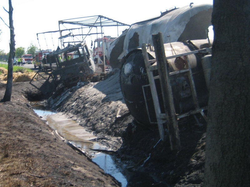 Na cysterny najechała trzecia ciężarówka. Samochody spaliły się doszczętnie. Zginęli kierowcy cystern. Kierujący trzecią ciężarówką wyskoczył z auta w ostatniej chwili.