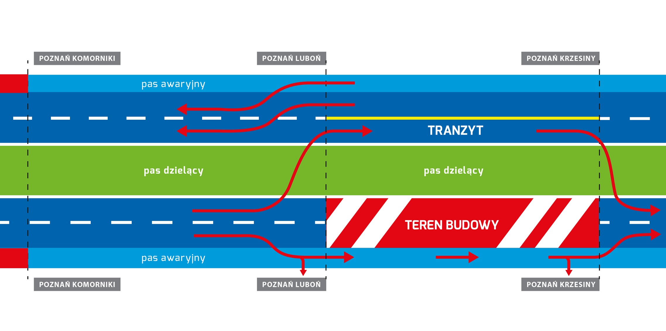 Zasada będzie podobna jak na pierwszym etapie. Na jezdni południowej w stronę Warszawy możliwy będzie tylko przejazd 1 pasem - awaryjnym. Z tego pasa będzie możliwy zjazd na węźle Krzesiny. Na jezdni północnej będą 3 pasy. Dwa dla jadących w kierunku Świecka, 1 tranzytowy w kierunku Warszawy - z tego pasa nie będzie możliwości zjazdu na Krzesinach.