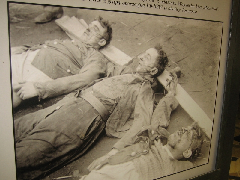 Na wystawie prezentowane są zdjęcia z archiwów Urzędu Bezpieczeństwa, na których pokazano ciała żołnierzy powojennego podziemia niepodległościowego tuż po ich zabiciu. Widać twarze z dziurami po kulach, krwawe plamy na ubraniach. Na jednym siedmiu zastrzelonych partyzantów ułożono na siedząco przy drzwiach stodoły.