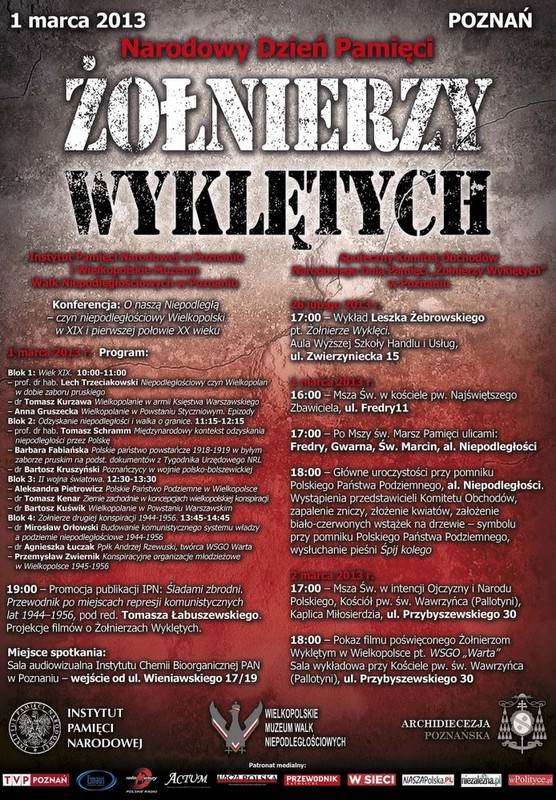 Kilkaset osób wzięło udział w poznańskim Marszu pamięci, którym uczczono bohaterów podziemia niepodległościowego. W uroczystościach Narodowego Dnia Pamięci Żołnierzy Wyklętych uczestniczyli kombatanci, mieszkańcy, młodzież. Uczestnicy przemarszu wznosili okrzyki: "Cześć i chwała bohaterom", "Armia wyklęta - Poznań pamięta", "Bóg, honor i ojczyzna", ale także "Raz sierpem, raz młotem, czerwoną hołotę". Przynieśli transparenty z napisami: "Chwała bohaterom, obrońcom ojczyzny, hańba zdrajcom sprzedającym teraz Polskę", "Poznań pamięta, żołnierze wyklęci. Bogu i ojczyźnie zawsze wierni". Marsz zakończył się pod pomnikiem Polskiego Państwa Podziemnego i Armii Krajowej. Za przybycie i za pamięć podziękował zebranym żołnierz Narodowych Sił Zbrojnych, płk Jan Podhorski. "Dziękuję, że przybyliście tu, aby upamiętnić moich kolegów. Żołnierze wyklęci jednak swoją walką - i w większości swoją śmiercią - doprowadzili do tego, że dzisiaj możemy się tu tak spokojnie spotykać" - powiedział.