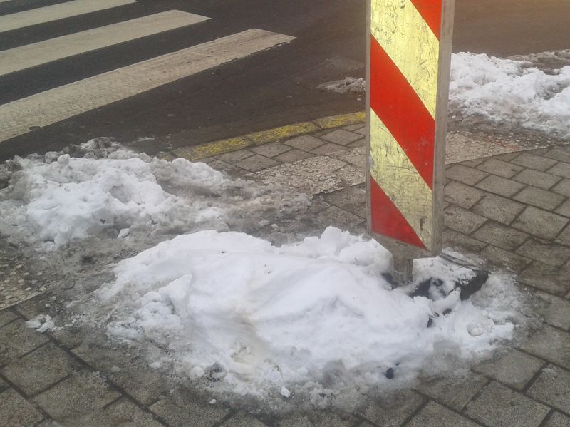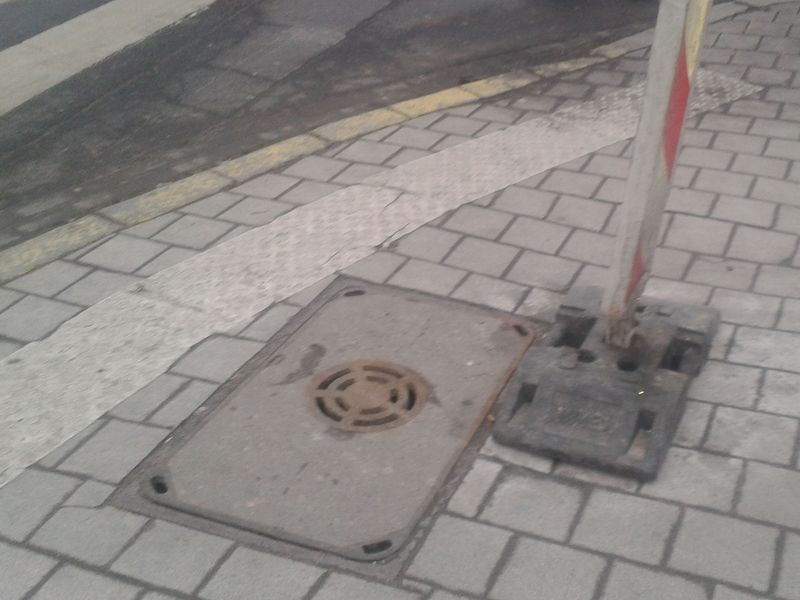 Dziura ma wielkość kostki chodnikowej. Zauważyliśmy ją kilka tygodni temu. Najpierw była niezabezpieczona, potem "oznaczono" ją papierami i kartonami, potem drogowym słupkiem. I ten stan trwa.