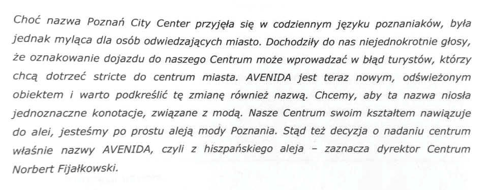 - Poprzednia nazwa nie była przez poznaniaków zbyt lubiana. Avenida to w języku hiszpańskim aleja. Poznań nie ma w tej chwili alei, przy której można zrobić zakupy, pochodzić, spędzić miło czas. My jesteśmy obiektem w centrum miasta, który pod dachem tworzy taką aleję. Nasze pasaże są w formie alei. Poznań City Center było nazwą bardzo mylącą - mówiła o centrum miasta, a naturalnym centrum Poznania jest Stary Rynek.