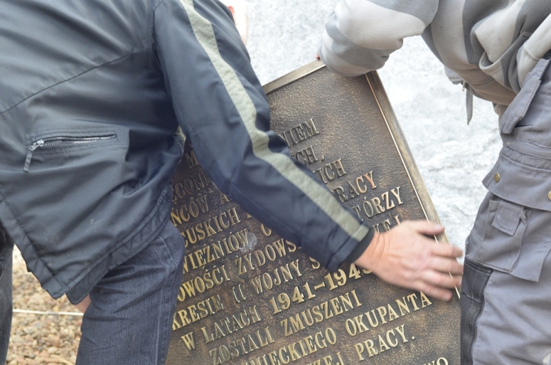 Na pamiątkowej tablicy znalazł się napis "Miejsce uświęcone cierpieniem jeńców angielskich, francuskich i rosyjskich oraz więźniów obozu pracy narodowości żydowskiej, którzy w okresie II wojny światowej, w latach 1941-1943, zostali zmuszeni przez niemieckiego okupanta do niewolniczej pracy”.