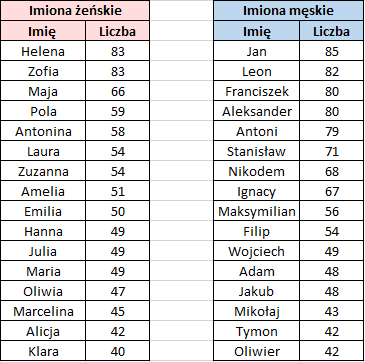 Wśród dziewcząt w Poznaniu na pierwszym miejscu są dwa imiona: Helena i Zofia. Jedno i drugie rodzice wybierali 83 razy. W całej Polsce w pierwszej trójce znalazły się: Zofia, Maja i Zuzanna. Heleny, która prowadzi w Poznaniu, w kraju nie ma w pierwszej dziesiątce.