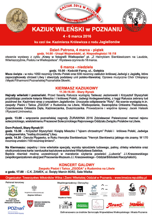 Na kiermaszu będą specjały kuchni kresowej, wyroby rękodzieła ludowego, palmy i chleby wileńskie. Kiermasz Kaziukowy na Starym Rynku w Poznaniu zacznie się od godziny 11.30 i potrwa do 16.00. Tegorocznego Kaziuka zakończy w Centrum Kultury Zamek koncert galowy Zespołu Pieśni i Tańca Zgoda z Rudomina na Litwie. Występy Zgody odbędą się także w tych dniach we Wrześni. Poznański Oddział Towarzystwa jest aktywny przez cały rok. Organizuje między innymi zbiórki darów dla Polonii Wileńskiej. Także coroczną "Akcję letnią" - kolonie nad polskim morzem dla dzieci z Wileńszczyzny.