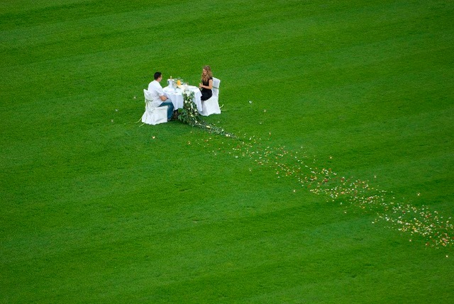 Kolację podano do stolika ustawionego po środku boiska. Wiodła do niego ścieżka ze świec i płatków róż. Także stół, przy którym biesiadowali zwycięzcy konkursu, był udekorowany kwiatami. Klimat podkreślało wewnętrzne oświetlenie stadionu oraz podświetlenie na niebiesko membrany tworzącej dach. Zwycięzców podchodzących do stolika powitała wyświetlona na stadionowych telebimach reprodukcja obrazu „Śniadanie na trawie” Edouarda Manet’a oraz muzyka jazzowa. Na życzenie gości towarzyszył im z telebimów i głośników zapis koncertu Kenny’ego G.