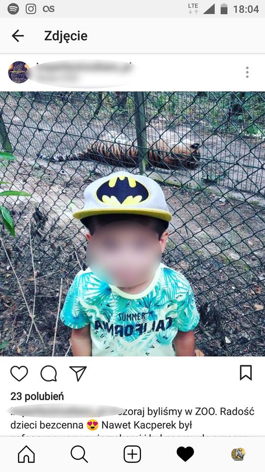 Dziecko wraz z matką weszło na zaplecze wybiegu, gdzie pracuje obsługa i nie mogą wchodzić goście. Kobieta zrobiła mu zdjęcia, wrzuciła je na Instagram i nawet oznaczyła w poście poznański ogród zoologiczny.