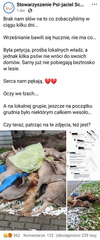 Tymczasem w schronisku przekazano, że truchła widoczne na zdjęciu zostały zebrane z dróg całej gminy przez cały miesiąc. Trafiają tam najczęściej przywiezione przez straż miejską, ponieważ schronisko ma chłodnię. Kwadrans przed przyjazdem firmy utylizacyjnej zwłoki zwierząt są wyjmowane z chłodni i układane w jednym miejscu. To wtedy zostały potajemnie sfotografowane. Po Sylwestrze do schroniska trafiła jedna sarna i była ofiarą wypadku drogowego. Nie jest wykluczone, że wybiegła na jezdnię przestraszona wybuchem petardy.