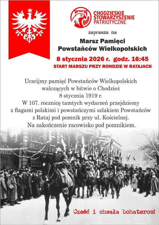 Marsz Pamięci Powstańców Wielkopolskich, którego organizatorem jest Chodzieskie Stowarzyszenie Patriotyczne, rozpocznie się dzisiaj o 16.45 w Ratajach koło Chodzieży.