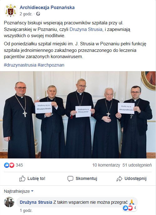 Post doczekał się odpowiedzi Drużyny Strusia, czyli po prostu lekarzy ze szpitala przy ulicy Szwajcarskiej, przekształconego na czas epidemii w szpital jednoimienny zakaźny. W komentarzu podziękowali i dodali, że z takim wsparciem nie można przegrać.
