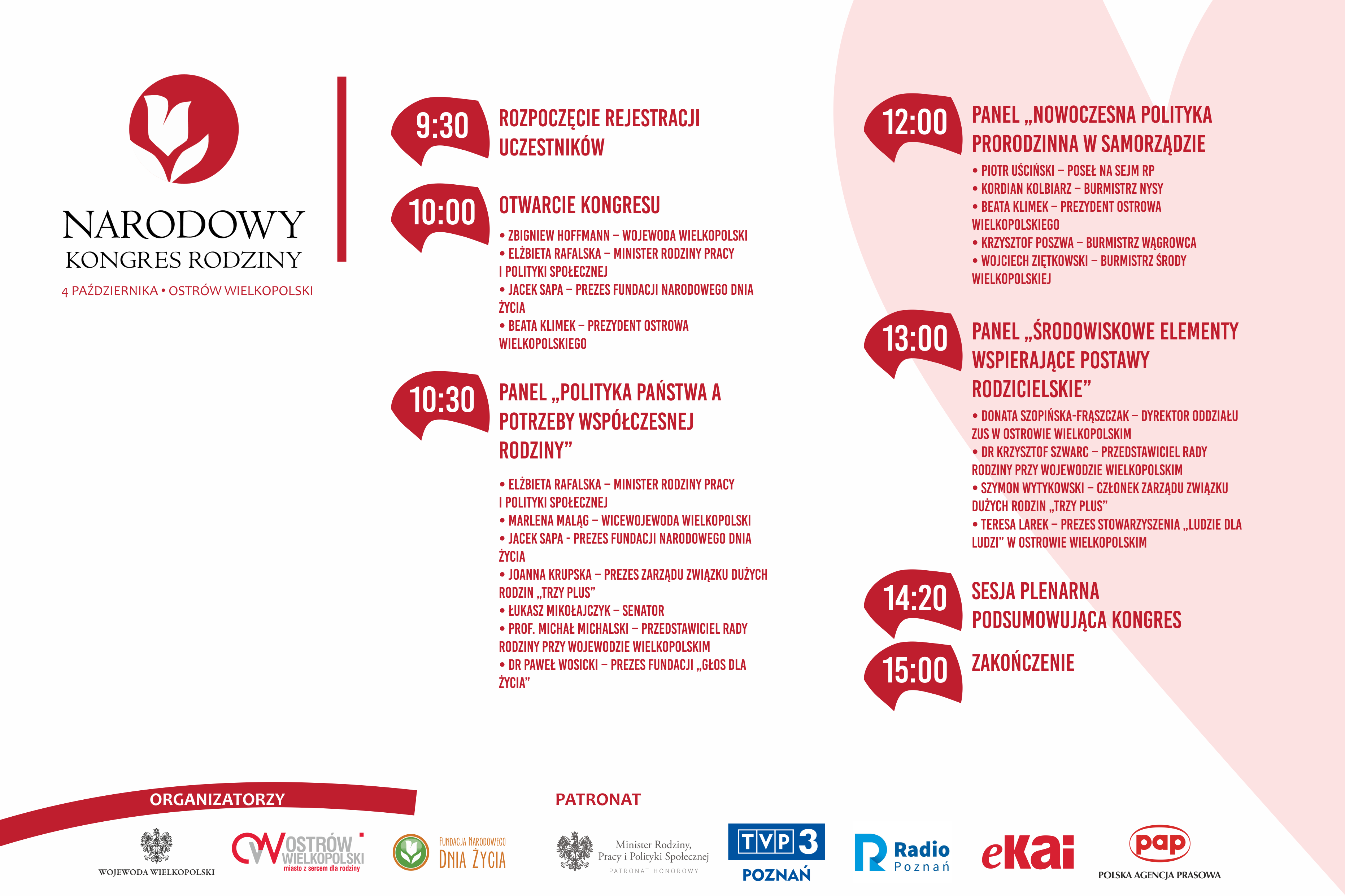Uczestnicy kongresu otwartego przez minister będą rozmawiać o polskiej polityce prorodzinnej. W debacie wezmą udział: eksperci, parlamentarzyści, przedstawiciele administracji rządowej i samorządowcy. Spotkanie zorganizowali wojewoda wielkopolski Zbigniew Hoffmann, Fundacja Narodowego Dnia Życia i miasto Ostrów.