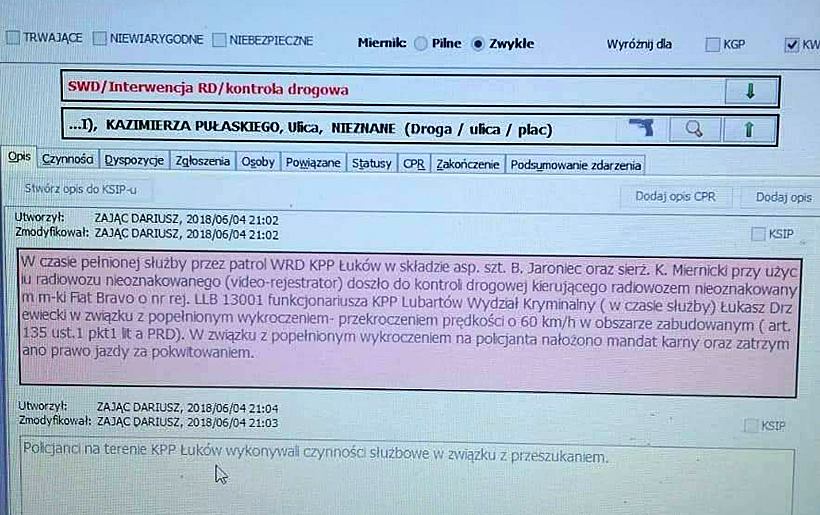 Z udostępnionego zrzutu ekranu z policyjnego systemu wynika, że nieoznakowany radiowóz z wideorejestratorem, należący do Komendy Powiatowej z Łukowa, zatrzymał do kontroli radiowóz marki Fiat Bravo, pochodzący z KPP Lubartów. Prowadził go policjant z Wydziału Kryminalnego.