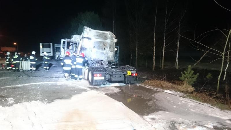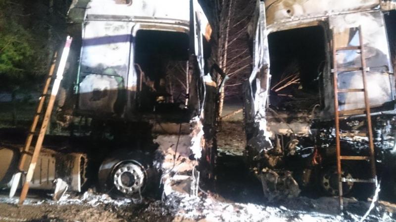 Pożarem zostały całkowicie objęte dwa zaparkowane obok siebie ciągniki siodłowe oraz pobliska sucha trawa wraz z drzewkami.