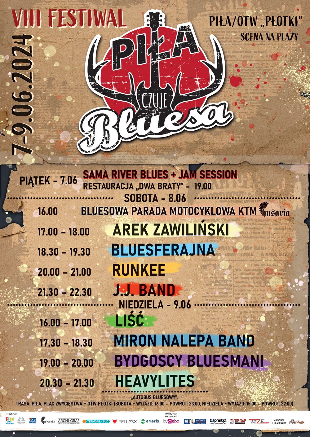 Festiwal odbywa się w tym roku przez trzy dni. Rozpocznie zespół Sama River Blues, który później zainicjuje Jam Session. Scena na plaży, szereg atrakcji. Serdecznie państwa zapraszam do Piły na Płotki na bluesa
