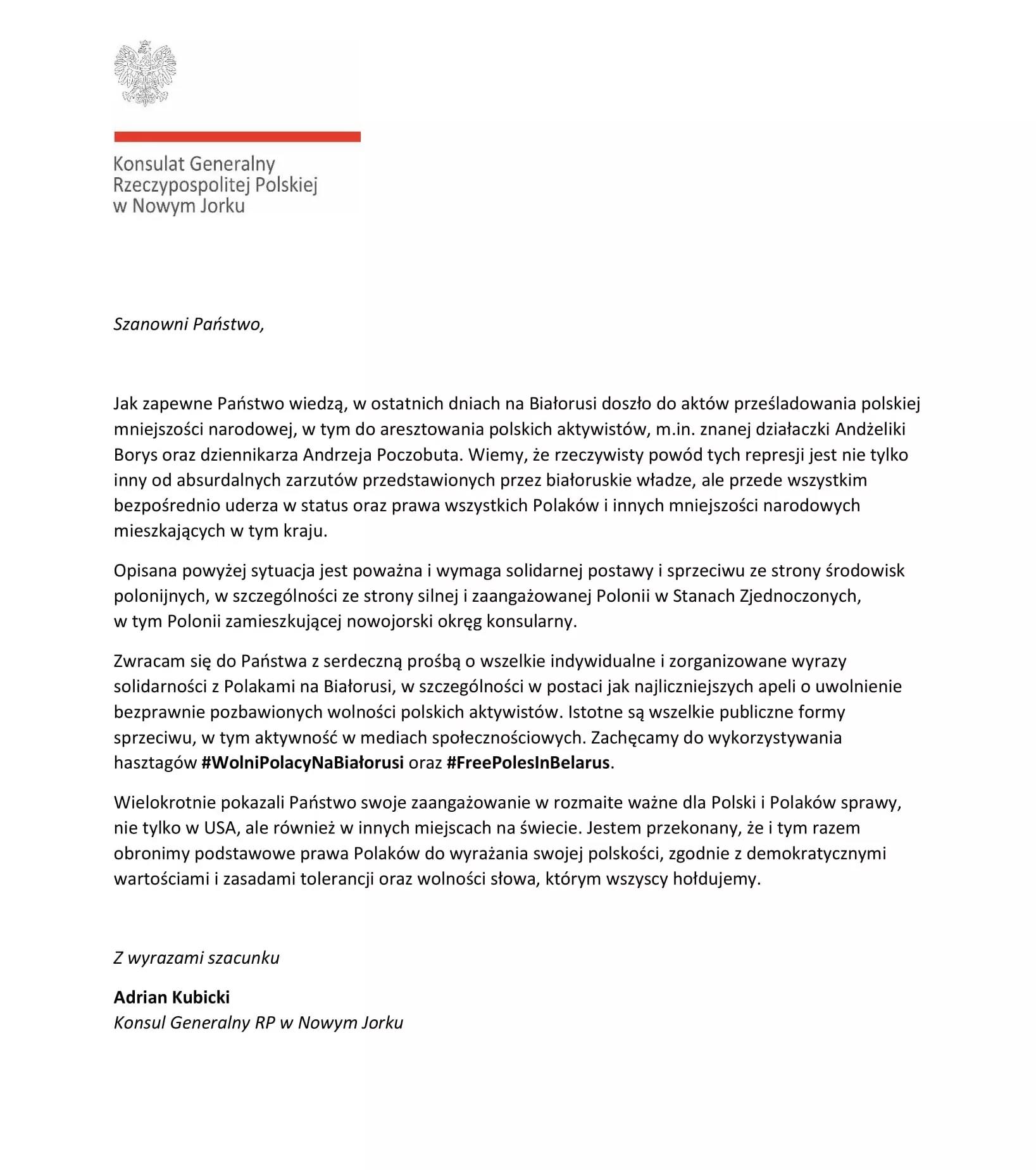 W tym celu stowarzyszenie apeluje do innych środowisk polonijnych o wsparcie i nagłośnienie problemu prześladowania Polaków. Apel wystosowały także polskie placówki dyplomatyczne, w tym Konsulat Generalny Rzeczypospolitej Polskiej w Nowym Jorku.