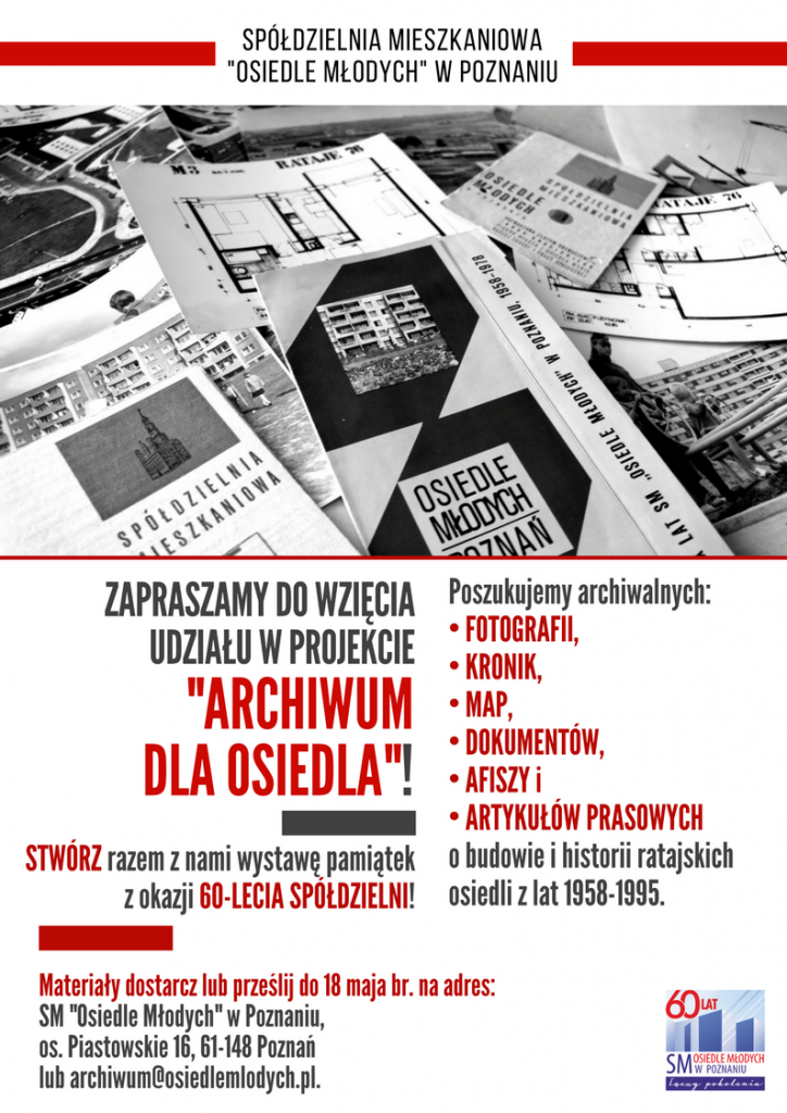Wspomniane archiwalia można dostarczyć/przesłać do 18 maja br. na adres: Spółdzielnia Mieszkaniowa „Osiedla Młodych” w Poznaniu, os. Piastowskie 16, 61-148 Poznań lub archiwum@osiedlemlodych.pl.