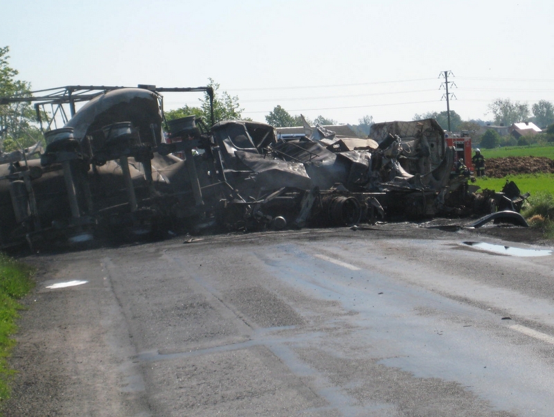 Do wypadku doszło między miejscowościami Dłoń i Smolice. - Doszło do zderzenia czołowego dwóch samochodów ciężarowych, które się zapaliły. Na to najechała trzecia ciężarówka. Jej kierowcy na szczęście udało się wyskoczyć z samochodu, ma drobny uraz nogi - mówi wiceszef krotoszyńskiej drogówki Ryszard Skowroński. Wszystkie samochody się spaliły, na dużej powierzchni jezdni jest wypalony asfalt.