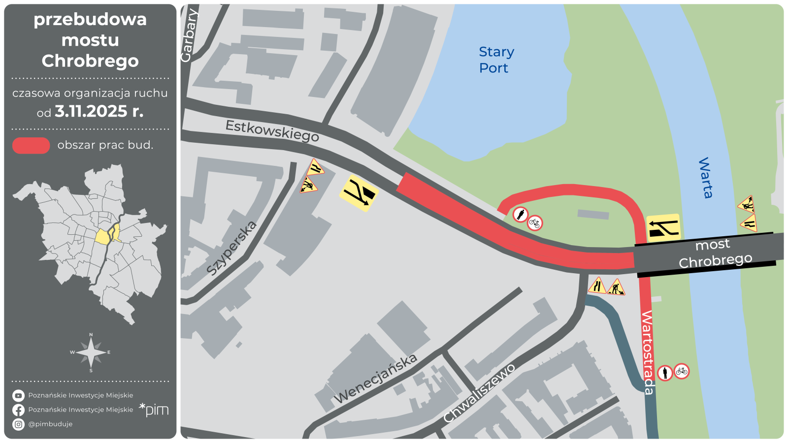 Most Chrobrego jest w złym stanie technicznym. Od poniedziałku zamknięta będzie jedna nitka przeprawy, a ruch samochodów w obu kierunkach będzie odbywał się drugą, po jednym pasie w każdą stronę. Kursowanie tramwajów będzie całkowicie wstrzymane od Okrąglaka aż do ronda Śródka.