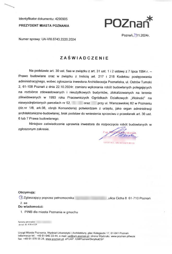 Są prowadzone na podstawie zaświadczenia z Oddziału Architektury IV, Wydziału Urbanistyki i Achitektury. Dla działek, na których są prowadzone prace nie była podpisana żadna umowa dzierżawy
