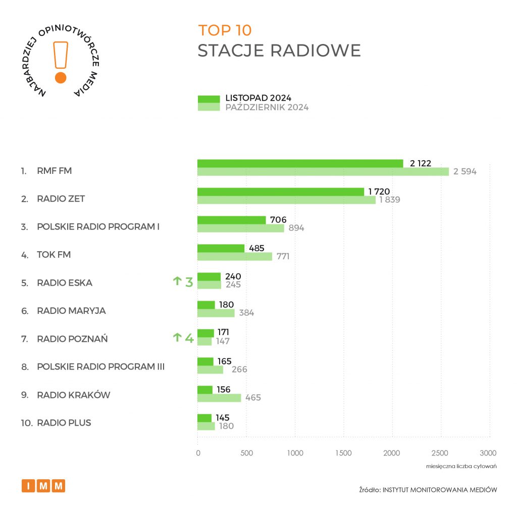 W kategorii Top Ten ogólnopolskich stacji radiowych autorzy opracowania napisali, że "awans aż o 4 pozycje - z wynikiem 171 cytatów w mediach - odnotowało Radio Poznań. W listopadzie redakcja podała informację o pilnej wyprowadzce dyplomatów z budynku Konsulatu Generalnego Federacji Rosyjskiej w Poznaniu. Decyzję przekazało polskie MSZ w związku działaniami zbrojnymi Rosji przeciwko Ukrainie oraz wojną hybrydową agresora z krajami zachodnimi". W kategorii Top Ten nasza stacja zajęła 7. miejsce wyprzedzając m.in. program III Polskiego Radia.